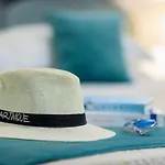 Il y a un accès gratuit à une plage privée avec des fauteuils, des coussins pour l'extérieur et des parasols.